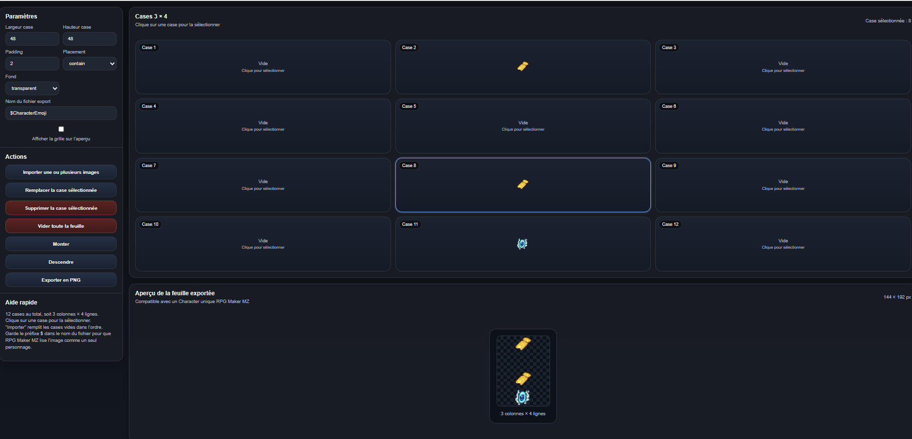 Ce fichier HTML permet de créer facilement une feuille de personnage 3×4 compatible avec RPG Maker à partir d’images ou d’émoticônes. L’utilisateur peut importer plusieurs images, les placer dans les différentes cases, les remplacer, les supprimer et les réorganiser. Un aperçu en direct montre le résultat final, avec la possibilité de déplacer chaque image dans sa case pour mieux l’ajuster. Enfin, l’outil exporte la feuille en PNG propre.